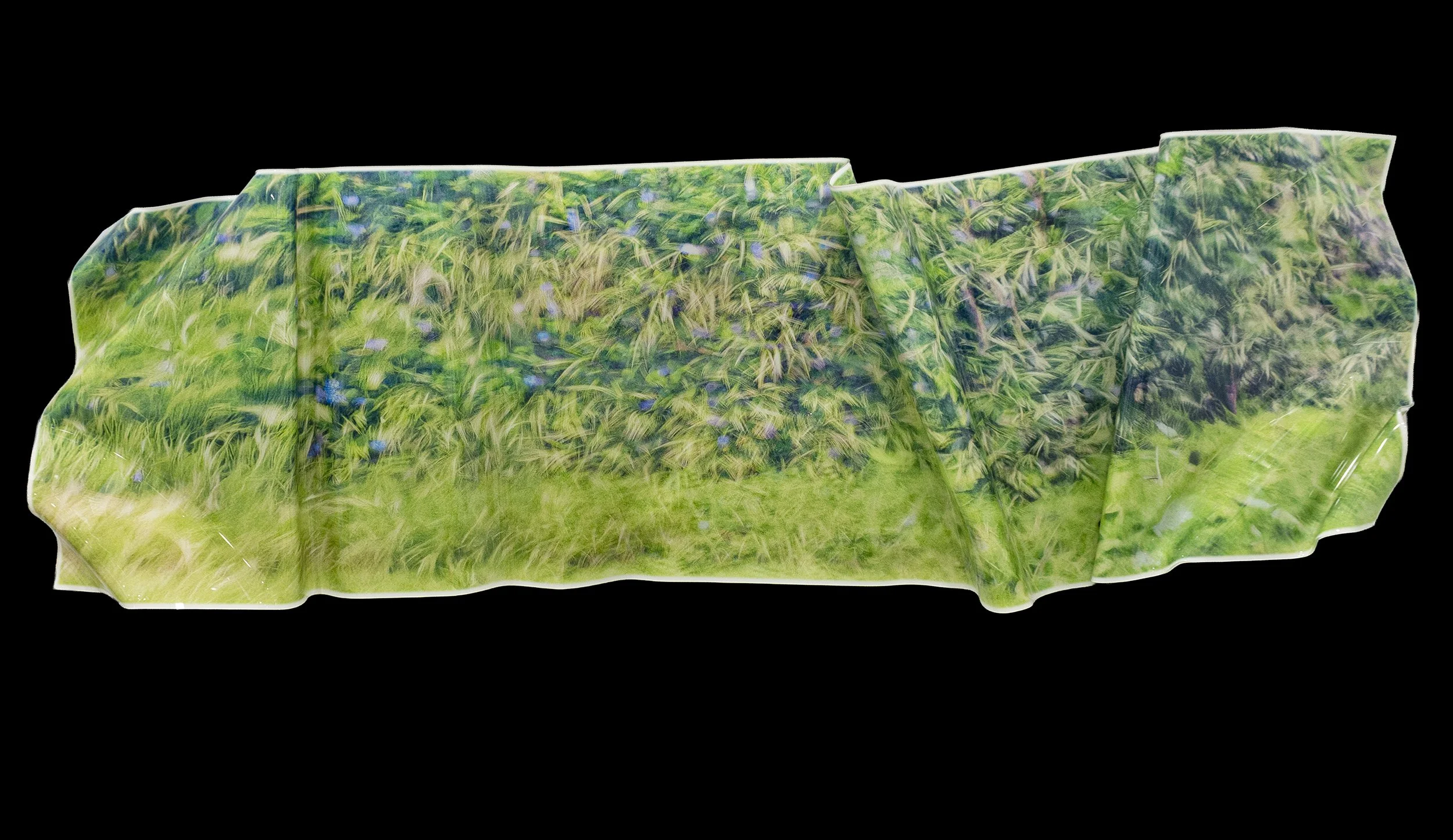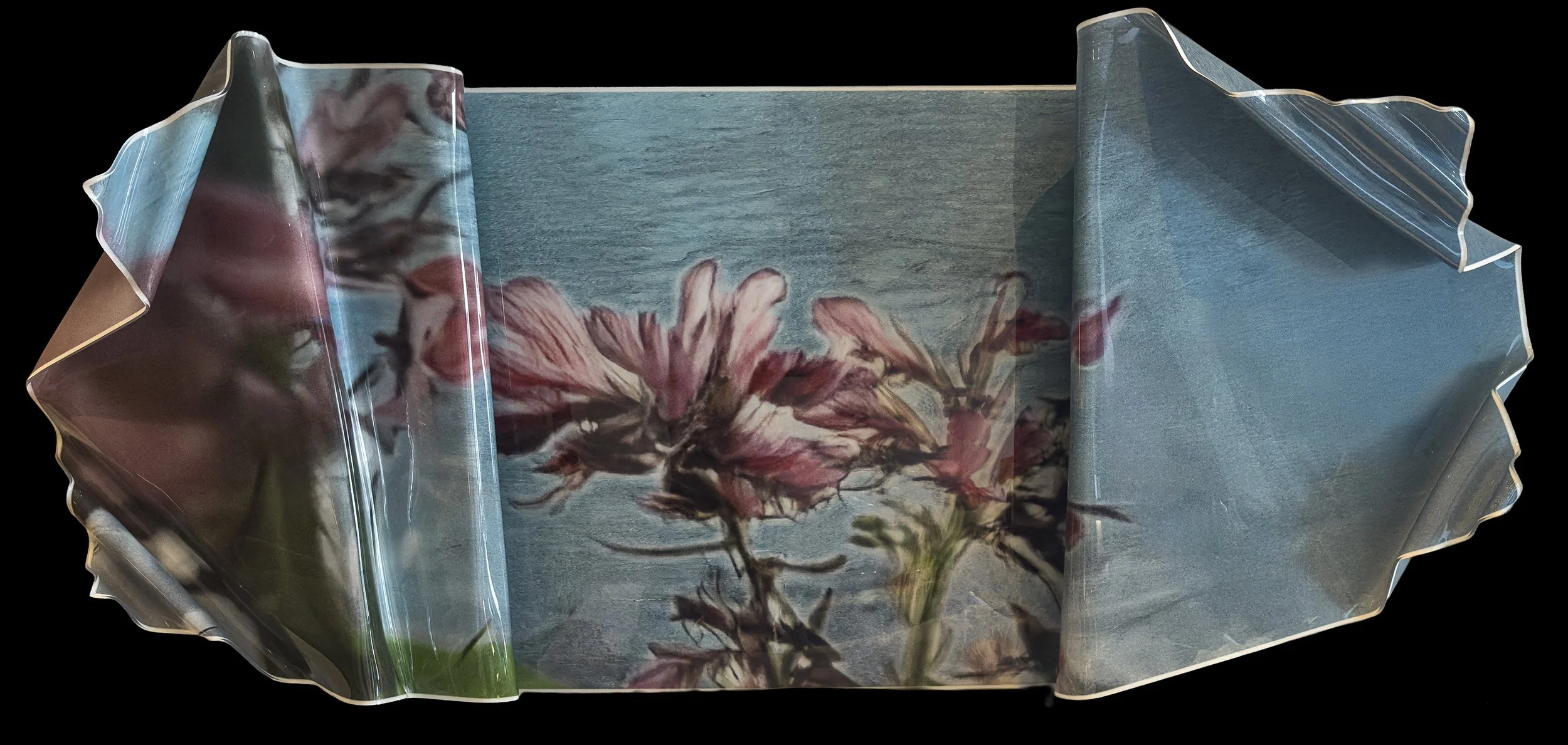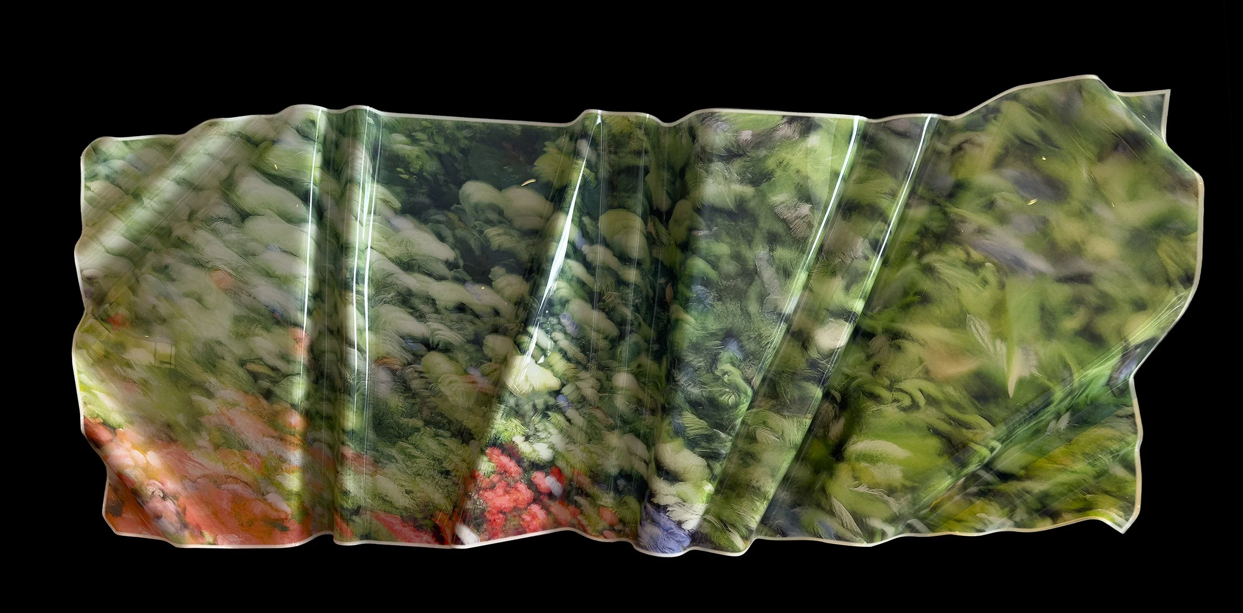 The works begin as photographic encounters made through slow movement and attentive walking. These images are then transformed through a hybrid process that combines AI collaboration, UV printing, and hand heat-forming acrylic. The resulting sculptural photographs resist flatness, occupying space as objects with posture, weight, and presence. Material is not forced into shape; it is listened to. Heat, gravity, and resistance play an active role in determining each work’s final form.
