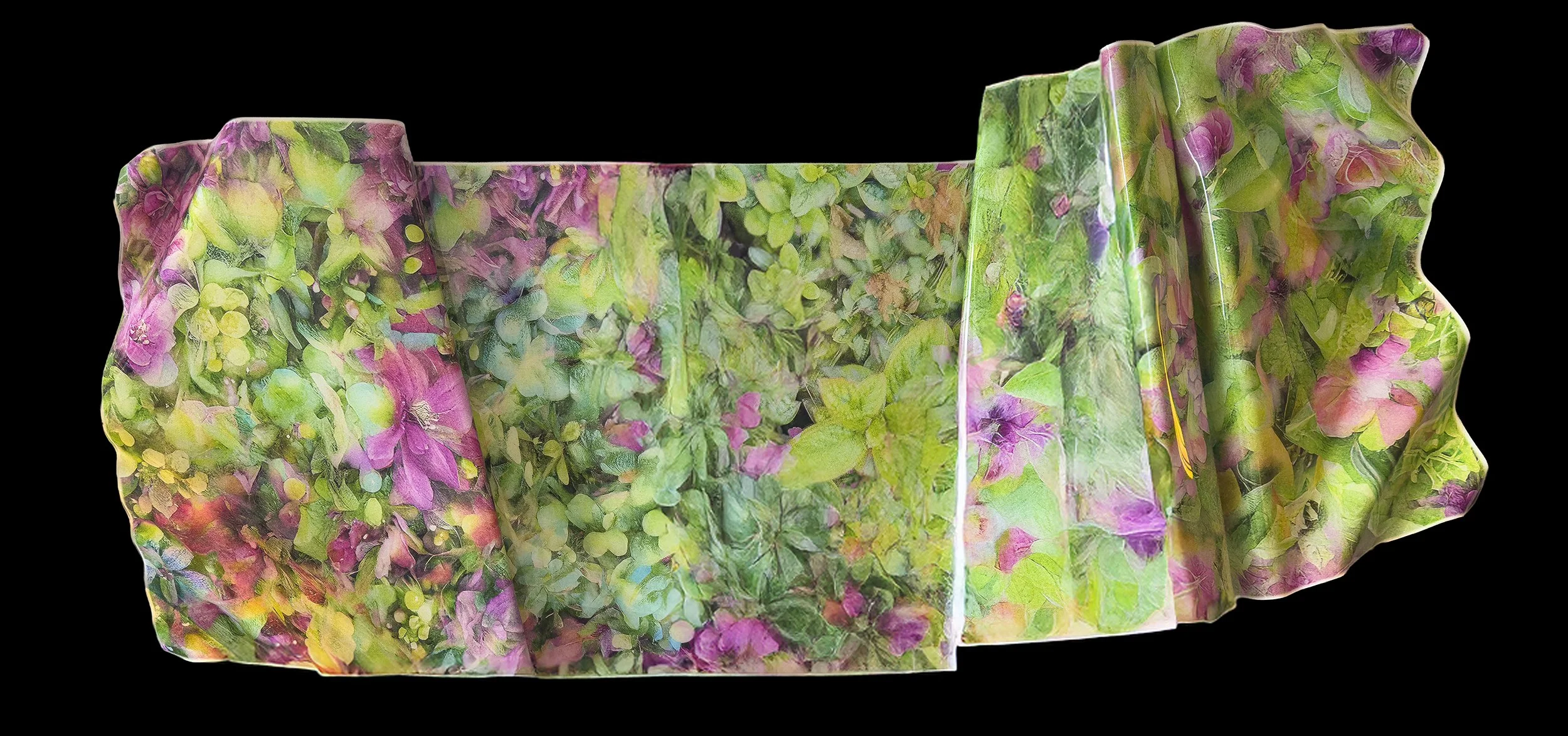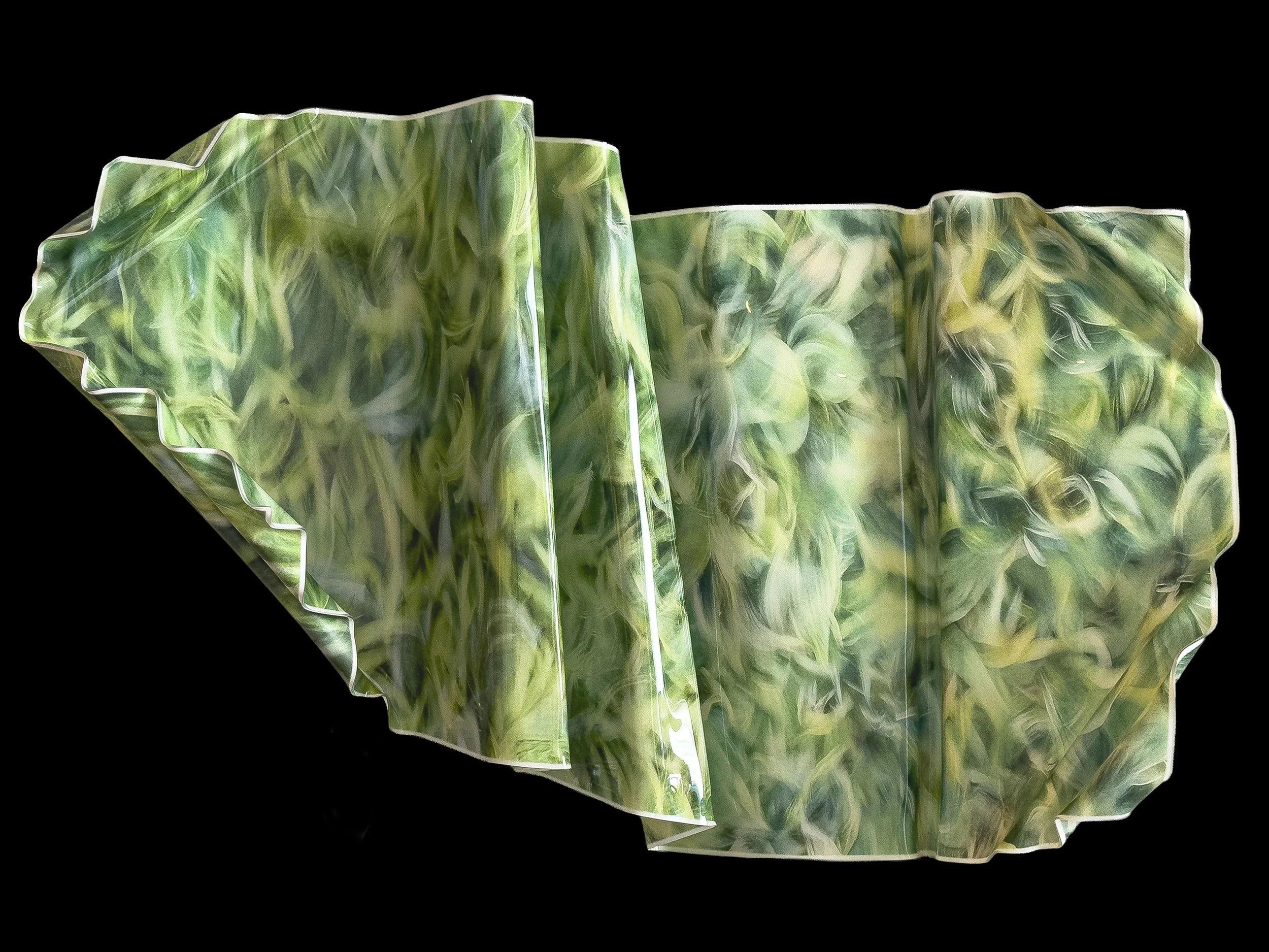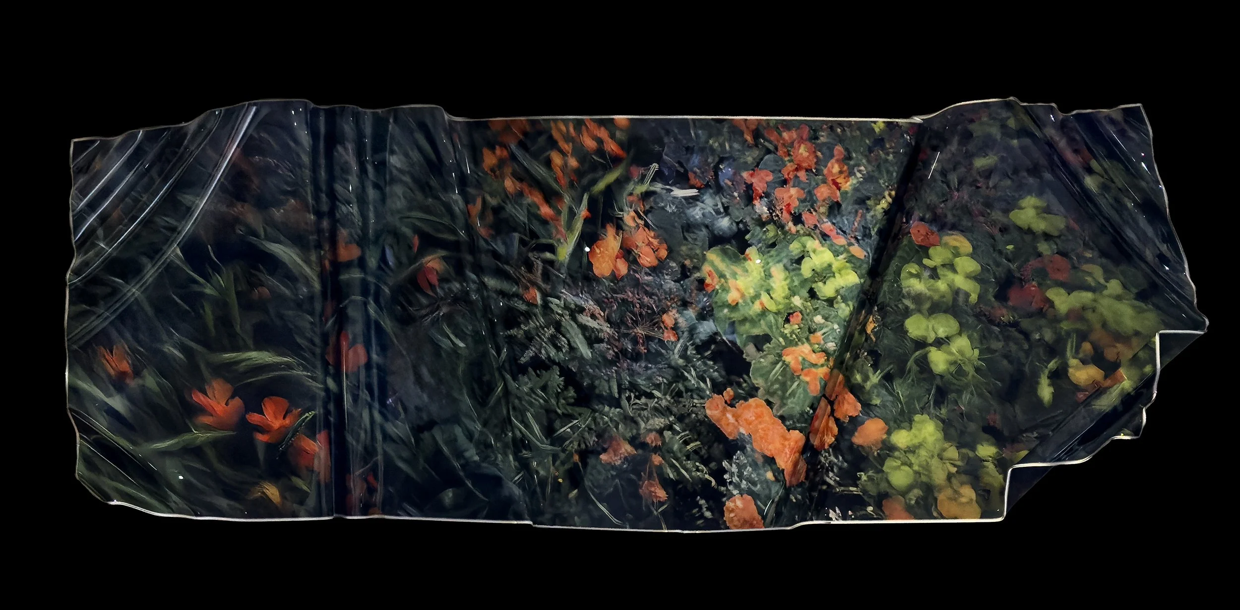 The works begin as photographic encounters made through slow movement and attentive walking. These images are then transformed through a hybrid process that combines AI collaboration, UV printing, and hand heat-forming acrylic. The resulting sculptural photographs resist flatness, occupying space as objects with posture, weight, and presence. Material is not forced into shape; it is listened to. Heat, gravity, and resistance play an active role in determining each work’s final form.